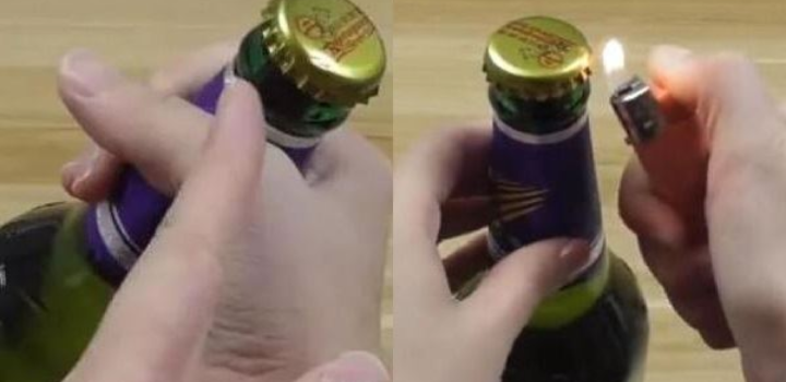 首先我們準備一個打火機,對著瓶蓋周圍慢慢烤一圈,這是利用了熱脹冷縮的原理使瓶蓋裡的膠條遇熱膨脹,讓瓶蓋變形。