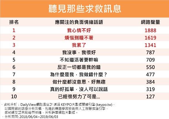 10大絕望話語,其中透露警訊! 當朋友笑著說「我沒事、我很好」,你會有什麼反應?能察覺這幾個字的背後不對勁嗎?現代人生活在高壓之下,情緒問題已成為人類必須面對的課題,真的不是短短的「玻璃心、無病呻吟」幾個字就可以一笑帶過,而是關乎寶貴性命的嚴肅議題。 今日DailyView網路溫度計就透過《KEYPO大數據關鍵引擎》調查,整理出有負面情緒的人經常說的十大「應關注的負面情緒話語」,希望透過這份調查,幫助你檢視自己是否已壓力超標,也觀察身邊親友是否也深陷在負面情緒的漩渦之中…需要你伸出援手,幫助他平安上岸。 第十名、已經很努力了可是... 努力付出卻遲遲不見結果,再怎麼努力卻無法轉變現況?這樣的瓶頸常讓人感到灰心喪志,台大電機系教授葉丙成曾言:「不要再相信『自己努力就會成功』這件事」,就是希望打破「努力=成功」的迷思,因為這看似正面的教條,卻是許多人心理負擔的來源。 身邊有朋友感到沮喪嗎?也許他需要的不是加油,而是窩心的體諒與溫暖的慰藉,告訴他已經做得很好、可以休息一下了。 【延伸閱讀】2萬網友讚爆!她負債百萬闖紐約:30歲後,我發現世界是公平的 第九名、真的好孤單,沒人可以說話 渴求愛與關懷是人類本能,缺乏「被愛」的感覺,即使在熱鬧喧鬧的人群中,也會感到孤單;久而久之容易讓人築起心牆,開始對他人的關心感到彆扭,但每個人內心都還是希望有人可以陪伴、理解自己。